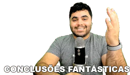 Rafael Procopio, a man with a beard, expresses satisfaction while wearing a black shirt with the phrase "Muita Coisa Bacana."
