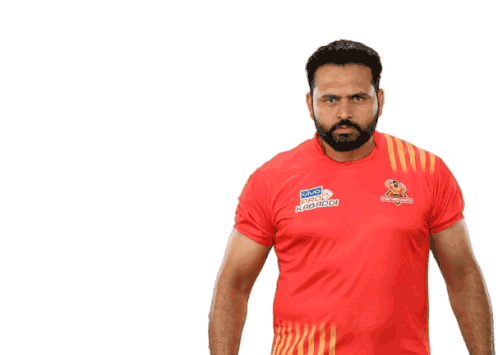A kabaddi player from Gujarat Fortunegiants flexing his biceps with a determined expression, celebrating a strong move.