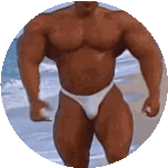 A very muscular man, a true bodybuilder, poses confidently on a sunny beach in a white brief, showcasing his impressive physique.