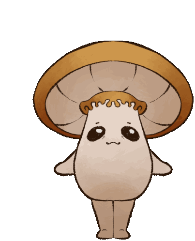 A cute, happy mushroom character dances with a big cap, moving its arms and legs and showing playful expressions.