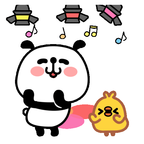 A cute panda and a little chick dance joyfully with music notes floating around them, expressing pure happiness.