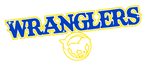 Animated logo for Mustang Cheer Wranglers featuring blue and yellow text and a horse emblem.