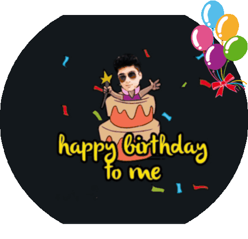 a boy is holding balloons and a cake with the words happy birthday to me below him
