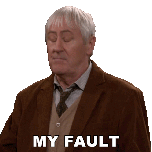 Alan Cornwall, from Frasier, closes his eyes and gestures, admitting 'My Fault' in this animated sticker.