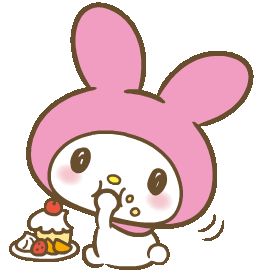 My Melody happily eats a delicious cake with a strawberry, getting crumbs on her face in this adorable animated sticker.