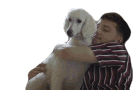 Andrew Bazzi lovingly embraces his white pet dog, holding it close in a warm hug, showcasing their strong bond.