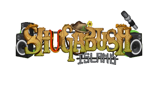 a logo for slugbus island has a microphone and speakers