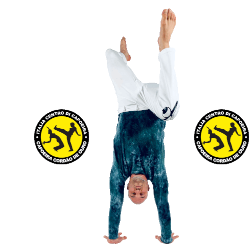 a man is doing a handstand in front of a logo that says italia centro di capoeira