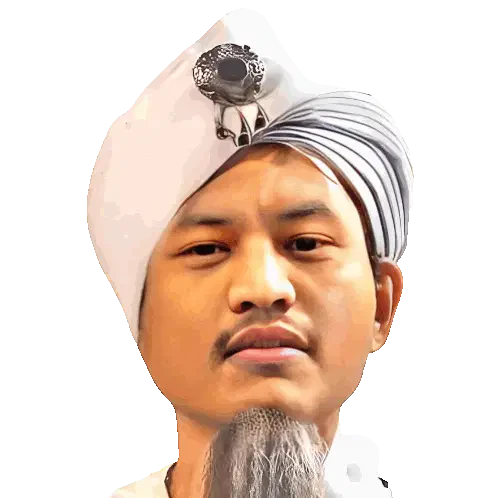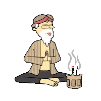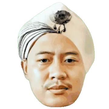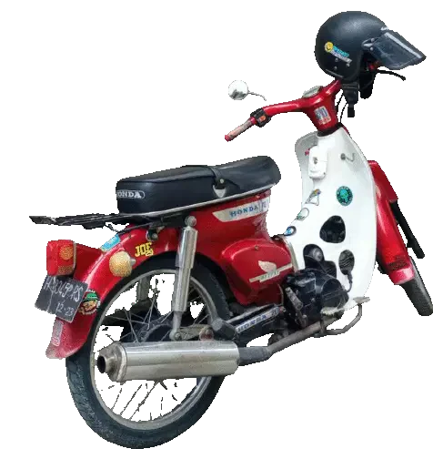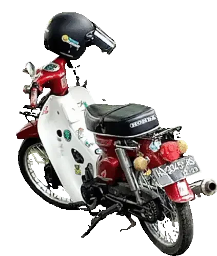 Animated sticker of Jarot riding a classic red Honda 70 motorcycle, with text changing from BUD to BUDA.