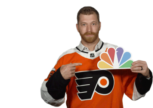 Claude Giroux, wearing a Philadelphia Flyers jersey, points to the colorful NBC Peacock logo, celebrating hockey on NBC Sports.