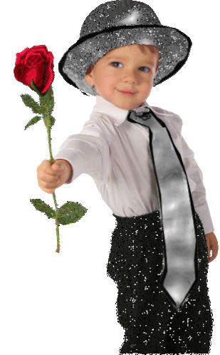 A sweet little boy in a sparkly outfit offers a single red rose, conveying a thoughtful and affectionate gesture.