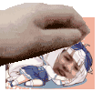 a hand is putting a person 's head on a table .