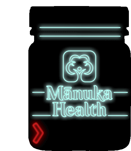 A glowing neon sign sticker for Mānuka Health, featuring their logo and brand name, with a blinking red arrow.