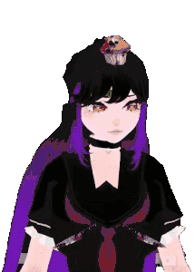 Animated sticker of Nerdere, a Vtuber with long purple hair, red eyes, and a cupcake on her head, embodying a yandere aesthetic.