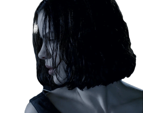 Kate Beckinsale as Selene from Underworld, with short dark hair, looks down with a nervous and concerned expression.