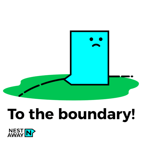 A blue character reacts with surprise and sadness as a red cricket ball goes 'To the boundary!', celebrating a cricket score.