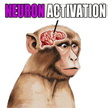 A funny animated sticker featuring a monkey with its brain highlighted and the text 'Neuron Activation', perfect for meme reactions.