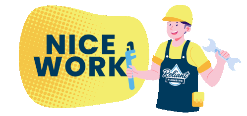 An illustrated plumber in uniform holding wrenches, with 'NICE WORK' text in a yellow bubble.