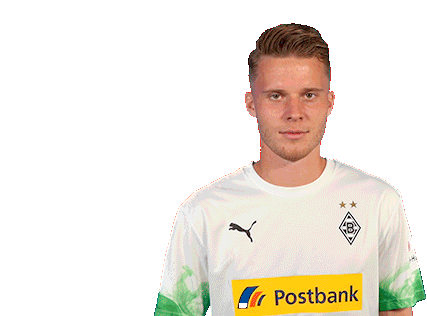 Nico Elvedi, wearing his Borussia Mönchengladbach kit, points his finger in a 'no' or 'don't' gesture.
