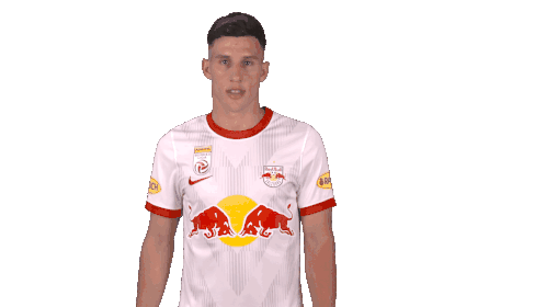 Nicolas Capaldo, wearing his white Red Bull Salzburg jersey with number 7, turns and points to his back in celebration.
