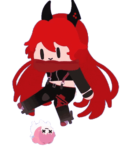 Nikke's Red Hood character, with red hair and horns, stomps on a small, defeated pink blob creature.