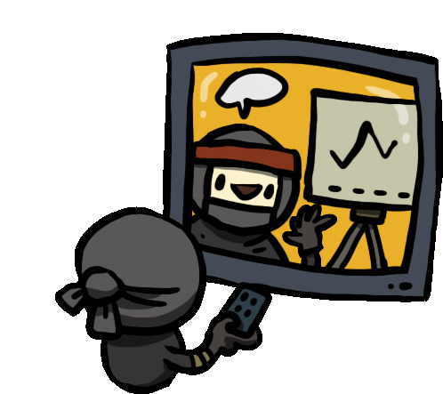 A cute cartoon ninja from Ninja Squad watches TV, holding a remote, with another ninja on screen waving.