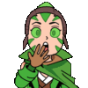 a cartoon character with green eyes and a green cape is covering his mouth with his hand .