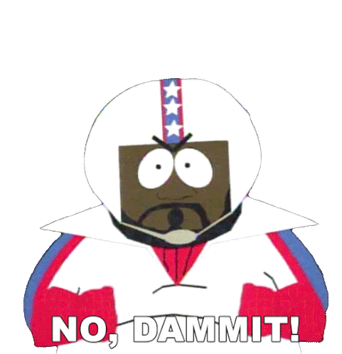 Chef from South Park, dressed as Evel Knievel, emphatically says 'No, Dammit!' with a stern expression.