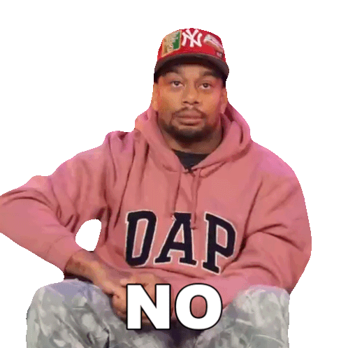 A man in a pink GAP hoodie and a New York Yankees hat emphatically says "NO" with a surprised expression.