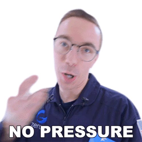 Austin Evans, wearing glasses and a Zero G shirt, gestures with his hands while saying 'No Pressure'.