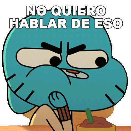 Gumball, the blue cat, looks annoyed and refuses to discuss something, expressing "I don't want to talk about it."