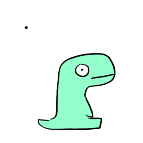 A cute, light green creature with one eye and a line mouth, showing five dots above its head, indicating silence or thought.