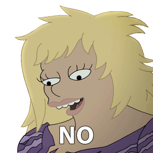 Ursula from Disenchantment expresses disagreement with a side-eye glance and the bold word 'NO' on her chest.