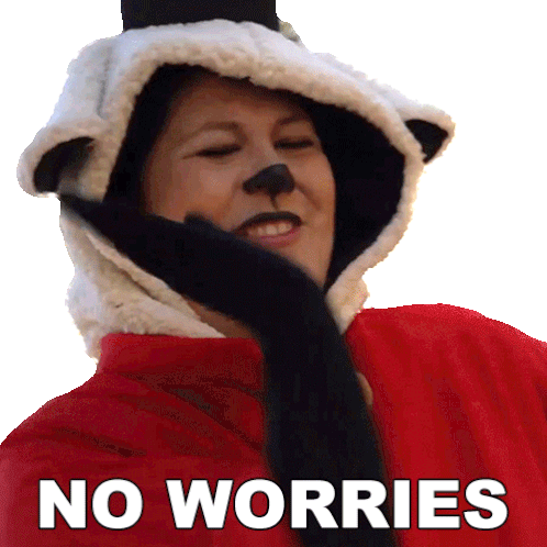 Gwen Pinkerton in a lamb costume shrugging with a 'No Worries' caption, expressing a relaxed and positive mood.