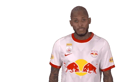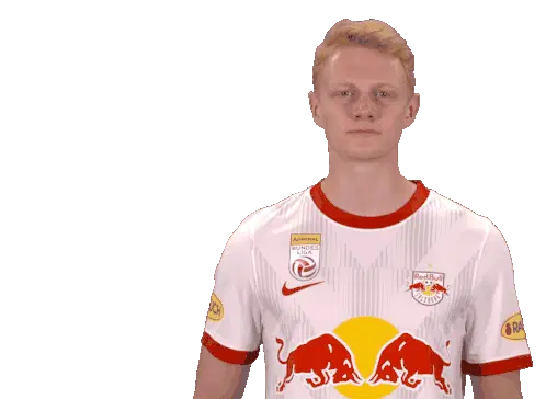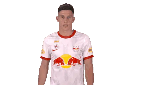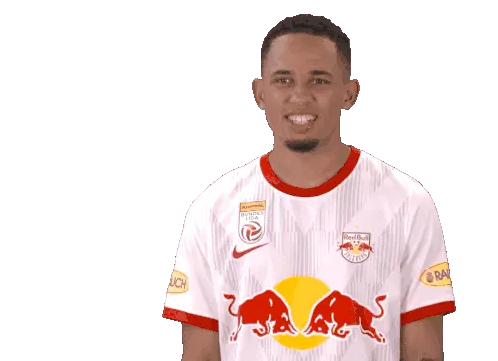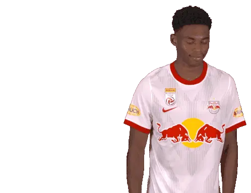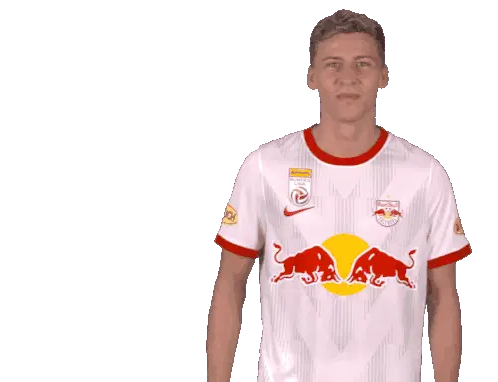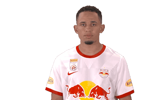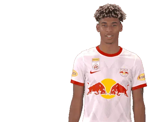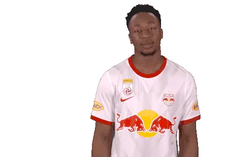 Noah Okafor, the Red Bull Salzburg football player, makes a 'cant hear you' gesture, then winks and points at the viewer.