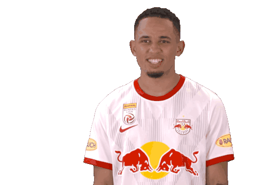 Noah Okafor, the Red Bull Salzburg player, celebrates with an energetic shout and clenched fists, showing his excitement.