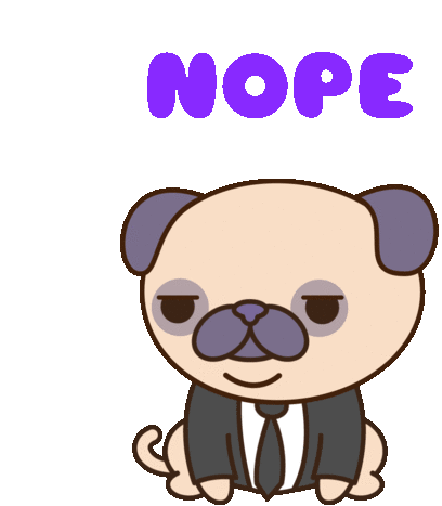 Frank The Pug, wearing a suit and tie, shakes his head in disagreement with the word 'NOPE' appearing above him.