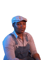 A person in overalls and a flat cap gestures 'no' with a head shake, conveying denial or refusal.