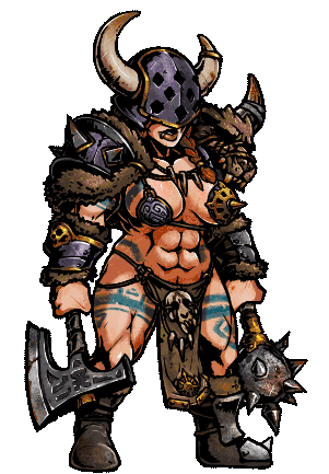 Norsca Girl, a powerful barbarian from Warhammer Fantasy, stands ready for battle with an axe and mace.