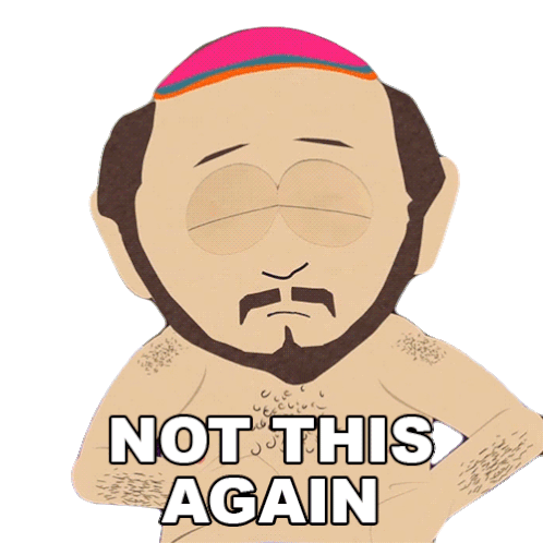 Gerald Broflovski from South Park expresses exasperation with a 'Not This Again' caption, looking up in disbelief.