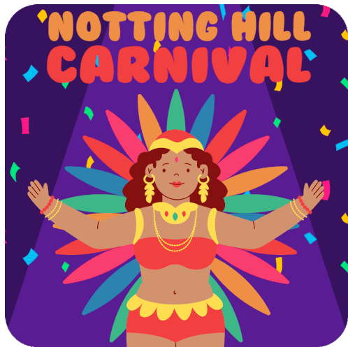 An animated poster for Notting Hill Carnival, featuring a joyful dancer in a vibrant costume with confetti falling, announcing 'IS HERE!'