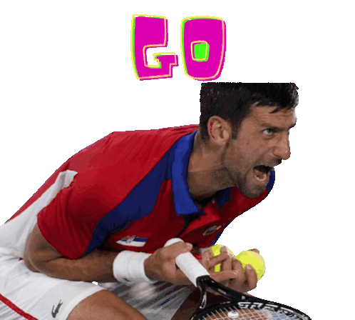 Novak Djokovic intensely yells "Gojushiho Dai" while holding a tennis racket and balls, blending tennis and karate in a funny meme.