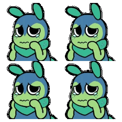 four images of a blue and green cartoon rabbit with different facial expressions
