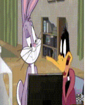 bugs bunny and daffy duck are looking at a computer screen together .