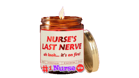A humorous animated sticker featuring a candle labeled 'NURSE'S LAST NERVE oh look... it's on fire!' with a flickering flame.