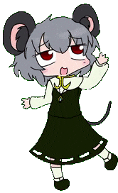 Nyn Cookie, a pixelated chibi mouse girl with grey hair and red eyes, joyfully dances and sways in this animated sticker.