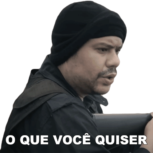 Pedro Benavides from Porta Dos Fundos says "O Que Você Quiser" (Whatever You Want) with a determined look.