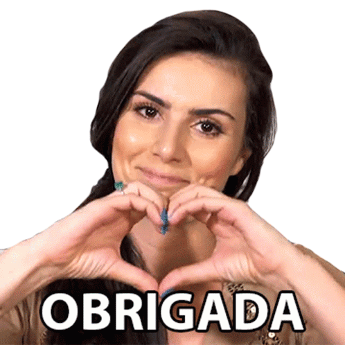 A woman with dark hair smiles and forms a heart shape with her hands, expressing gratitude with the word 'Obrigada' (Thank You).