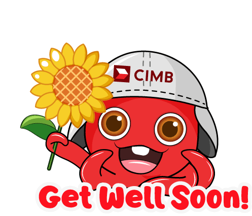 CIMB's red octopus mascot, Octo, wearing a hat and holding a bright sunflower, sends a cheerful 'Get Well Soon!' message.