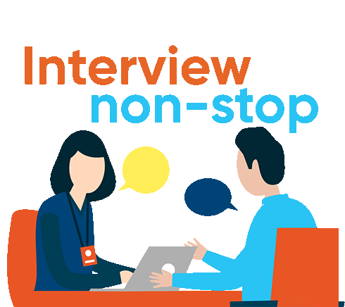 An animated sticker depicting a non-stop job interview in an office setting, with two people discussing.